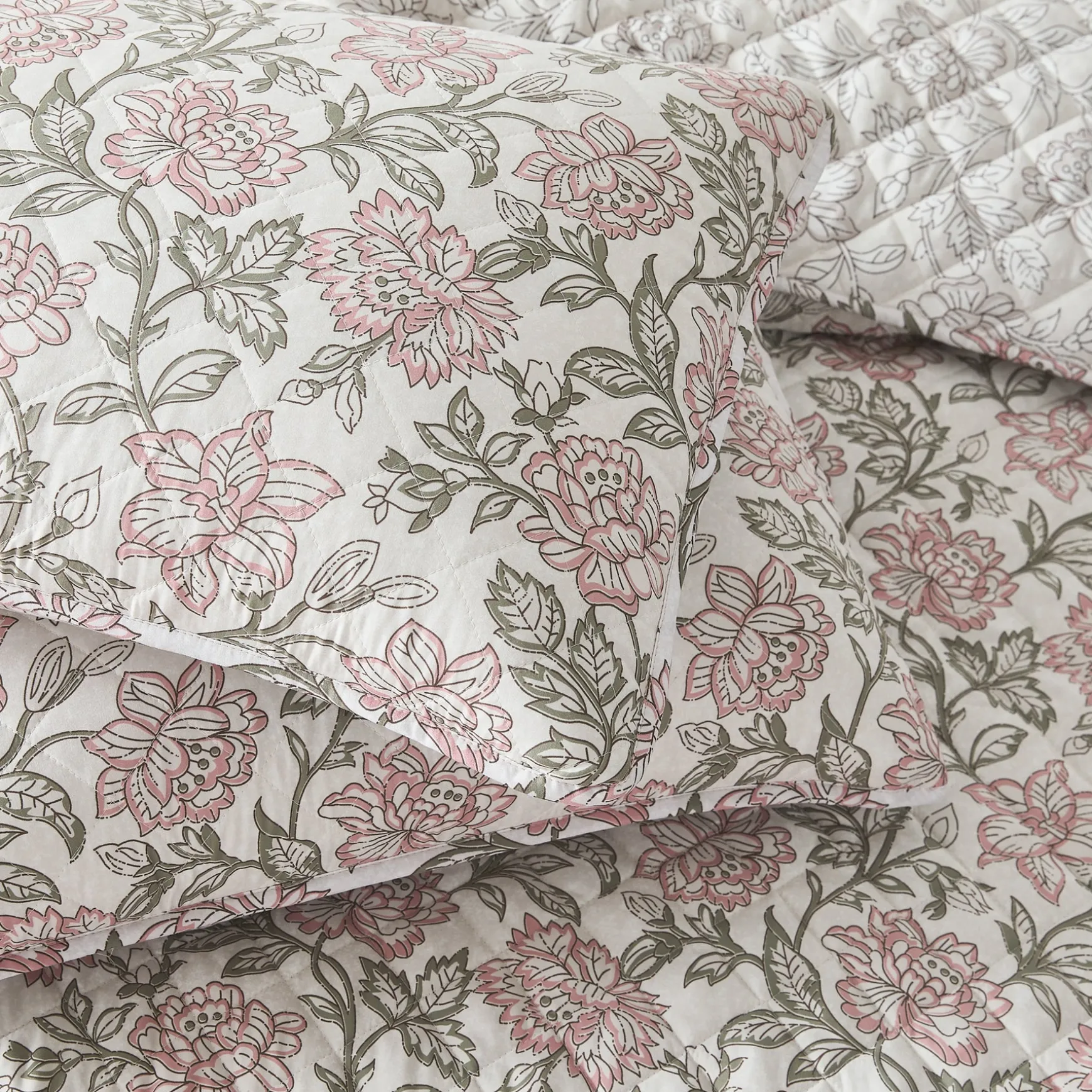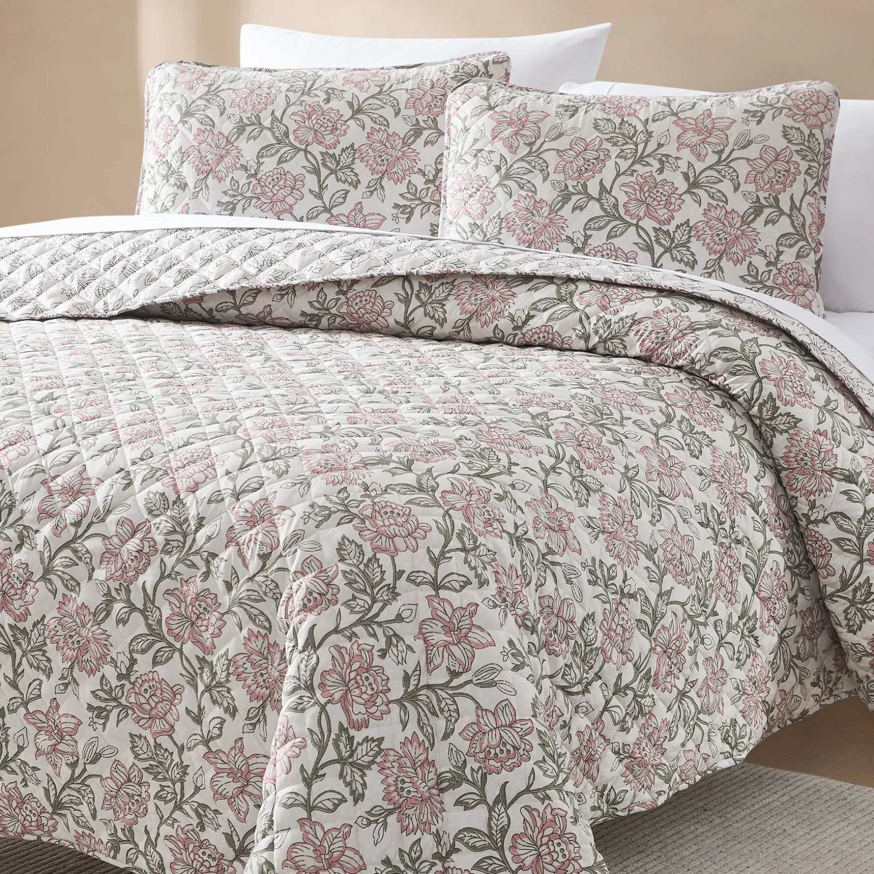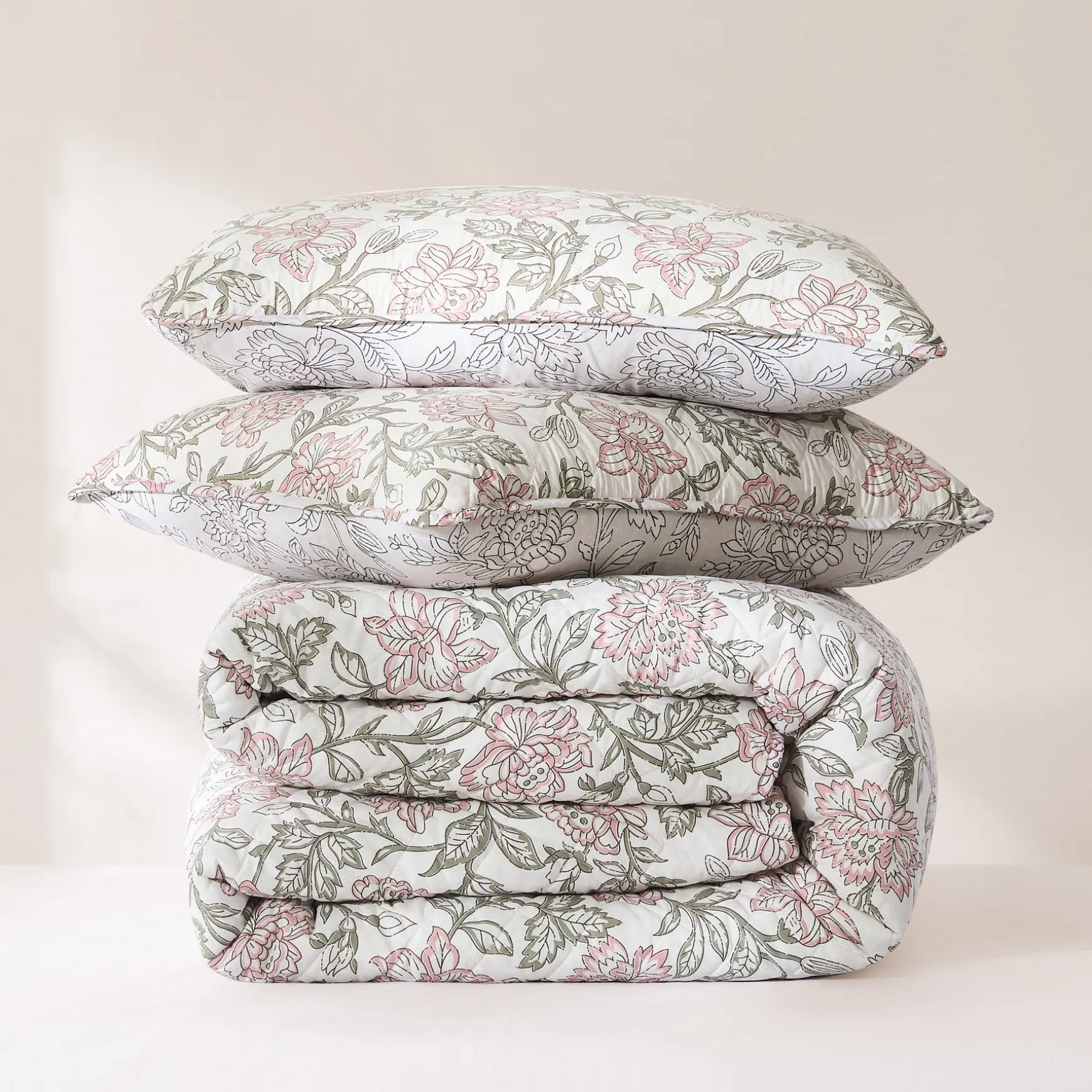 Add florals to your space with this block print quilt set. Designed with a traditional flower block print, this floral bedding blends boho and modern decor styles. The fully reversible design offers 2 beautiful color options. Crafted from a soft microfiber with a lightweight polyfill. This 3 piece bedding set includes 1 quilt and 2 shams. STANDARD 100 by OEKO-TEX® certified, all components have been tested and certified free from harmful substances. Machine washable for easy care.