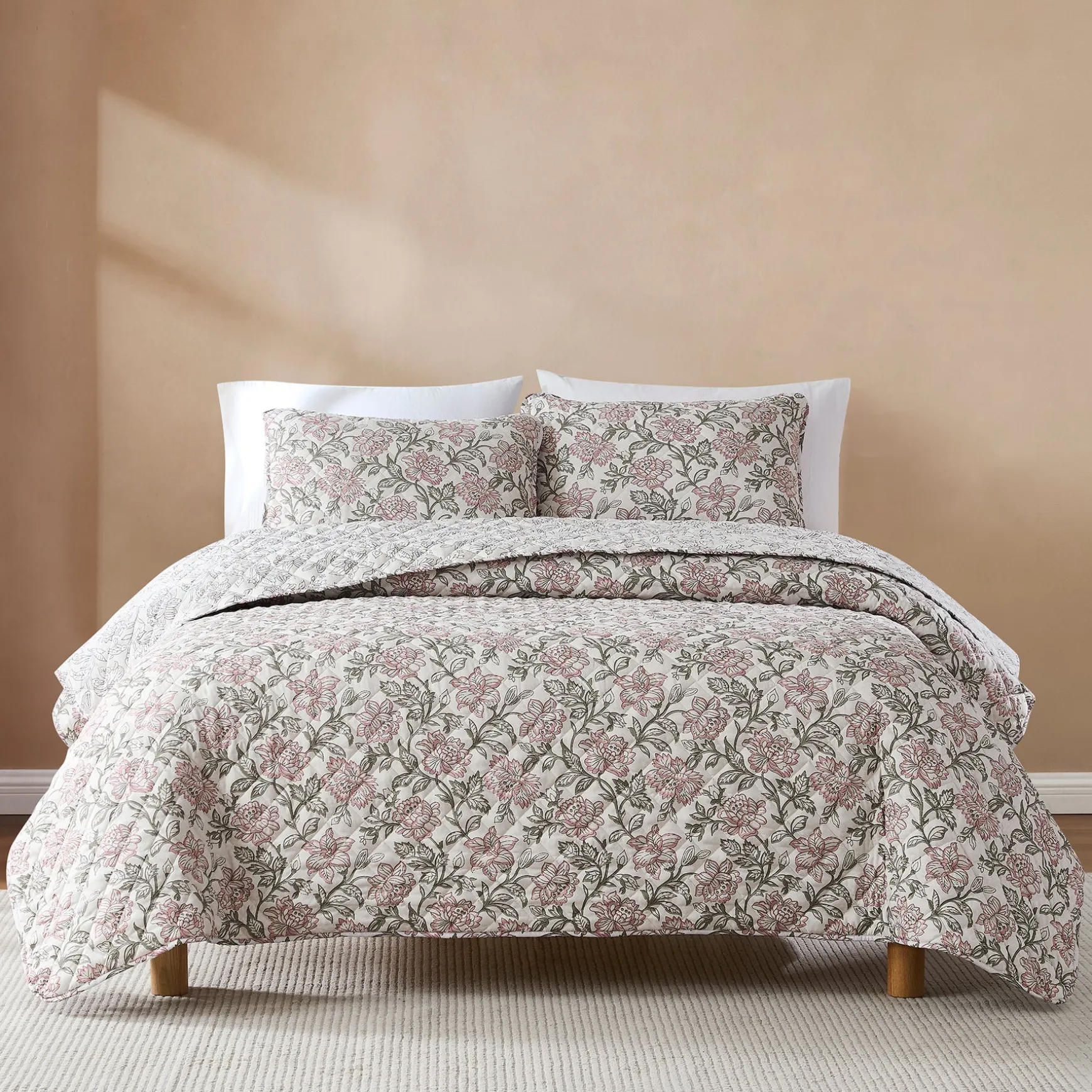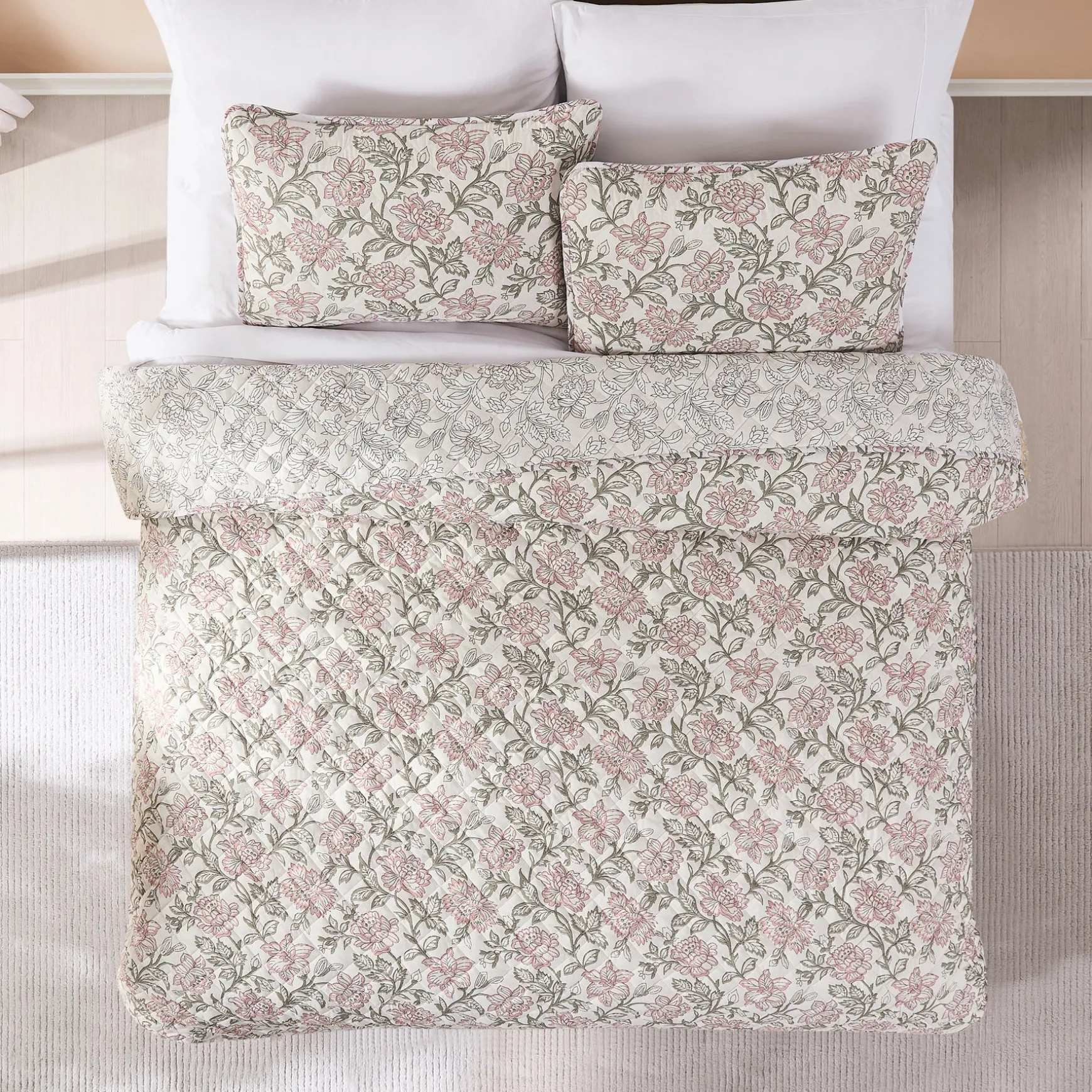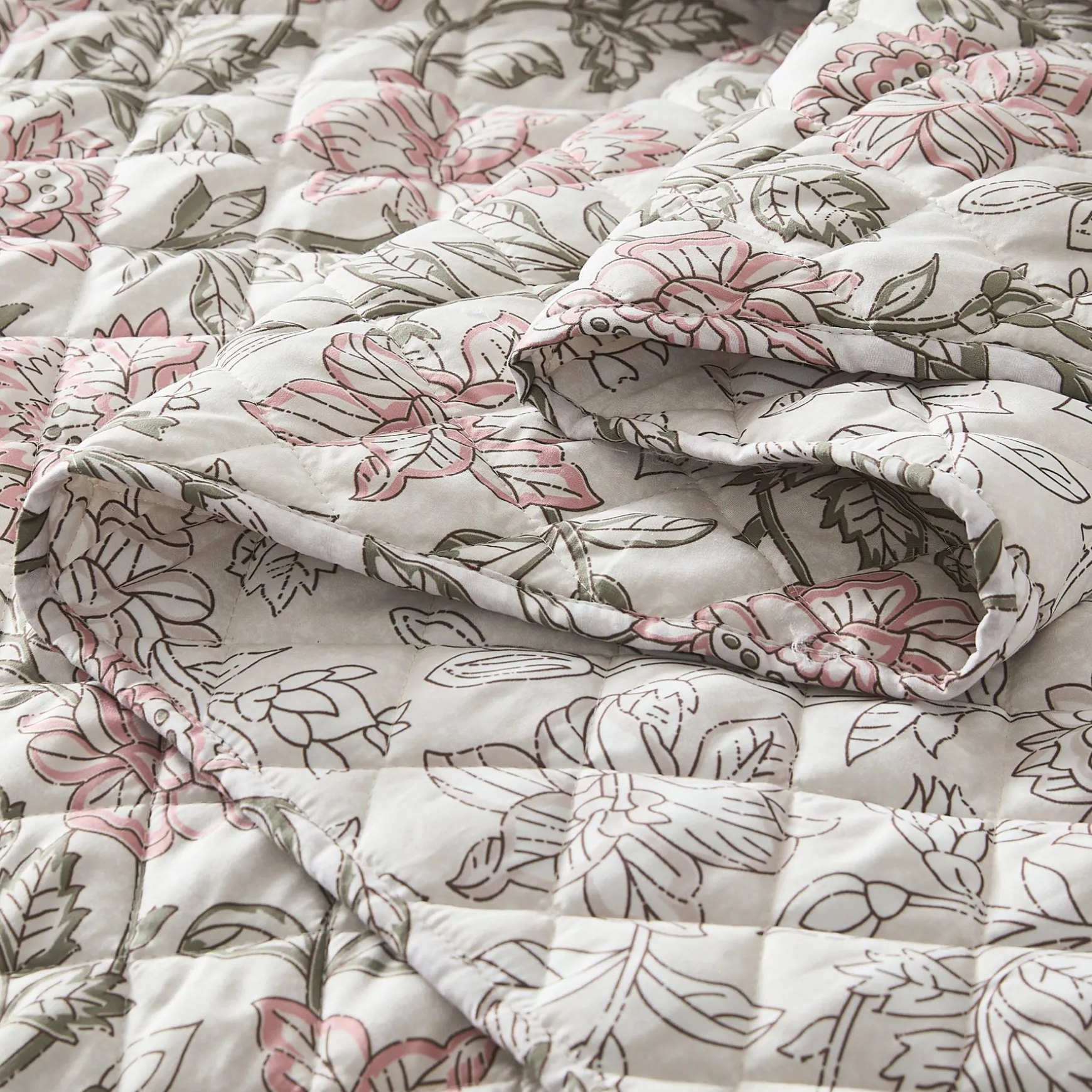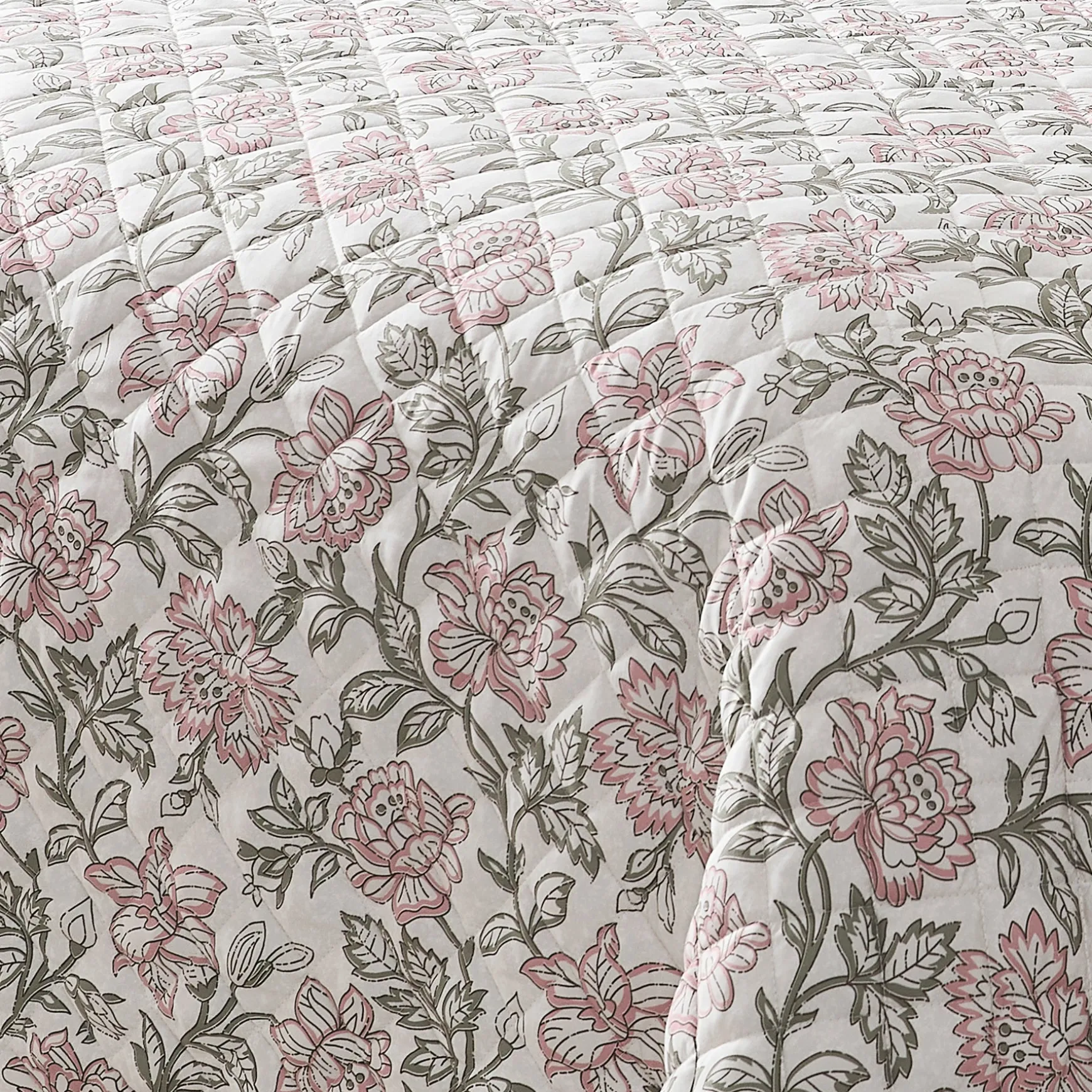 Add florals to your space with this block print quilt set. Designed with a traditional flower block print, this floral bedding blends boho and modern decor styles. The fully reversible design offers 2 beautiful color options. Crafted from a soft microfiber with a lightweight polyfill. This 3 piece bedding set includes 1 quilt and 2 shams. STANDARD 100 by OEKO-TEX® certified, all components have been tested and certified free from harmful substances. Machine washable for easy care.